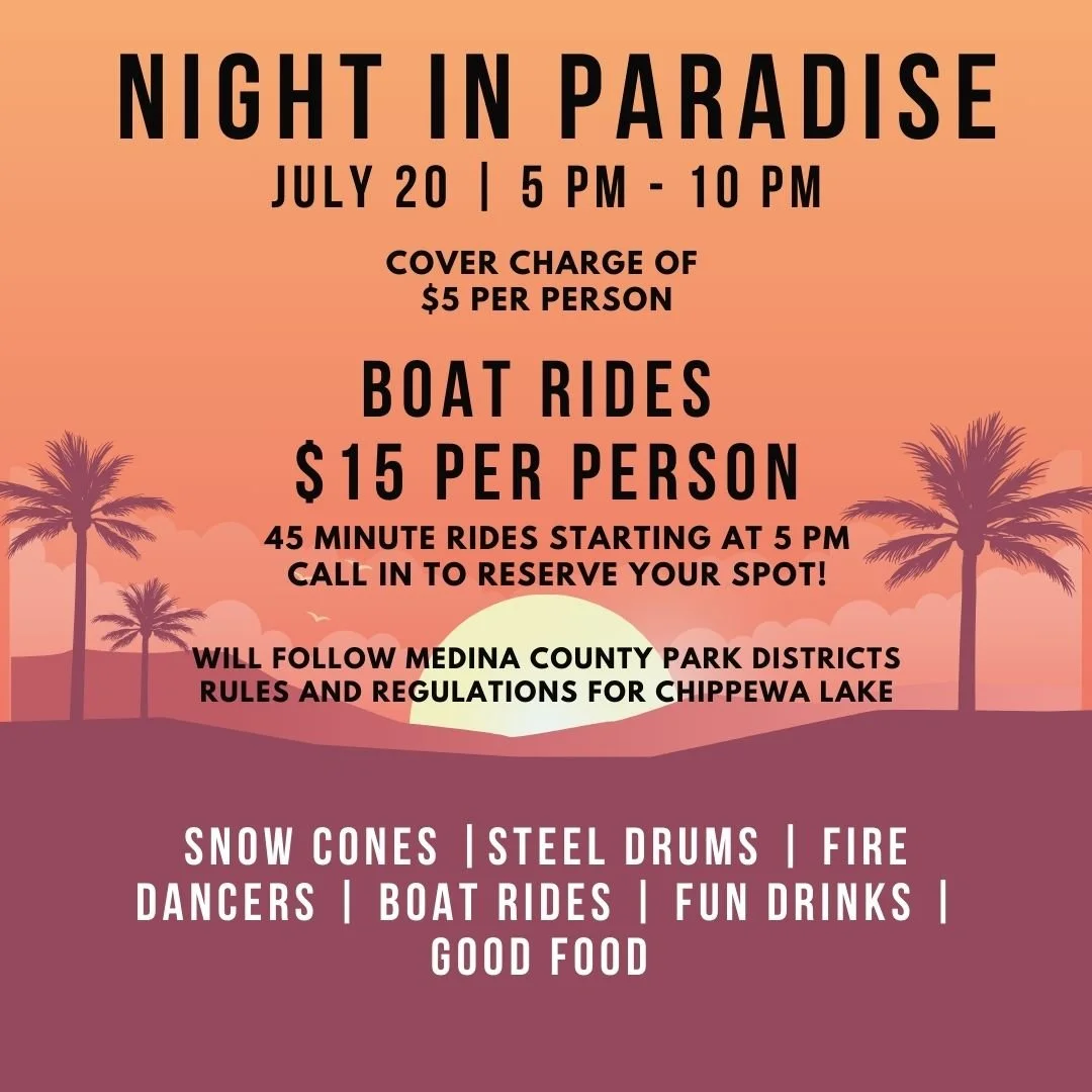 A Night In Paradise Saturday, July 20, 2024 5:00 PM 10:00 PM The Oaks Lakeside 5878 Longacre Lane Chippewa Lake, OH, 44215 United States (map) Google Calendar ICS Join us for live steel drums with Scott Sopata, Fire Dancers, Boat Rides, Snow Cones, Tiki Bar, Fun Drinks, and Good Dinner Specials! Make reservations today!